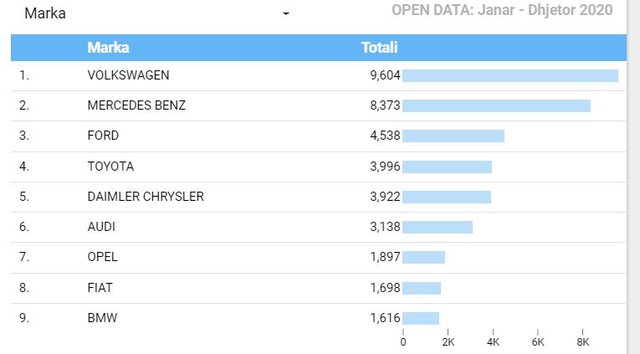 Marka më e preferuar në vitin 2020 është “Volkswagen”, me 21% të të regjistruarve, e cila më pas ndiqet nga “Benz-i” dhe makina tip “Ford”. Mesa duket, çmimi më i shtrenjtë i “Benz-it” ka detyruar shqiptarët të mos e blejnë.