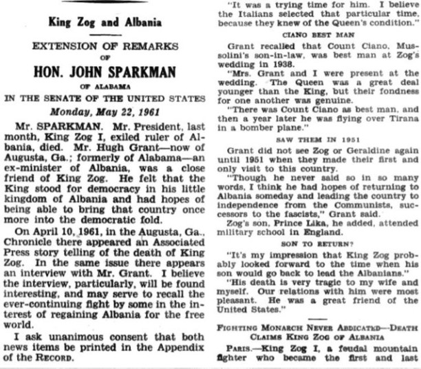 E hënë, 22 maj 1961. Z. Sparkman : Zoti President, muajin e kaluar, Mbreti Zog I, sovrani në ekzil i Shqipërisë, vdiq. Z. Hugh Grant – tani në Augusta, Ga.; më parë në Alabama – një ish-ministër në Shqipëri, ishte një mik i ngushtë i mbretit Zog. Ai ndjeu që Mbreti qëndronte për demokracinë në mbretërinë e tij të vogël të Shqipërisë dhe kishte shpresë se do të ishte në gjendje ta sillte atë vend edhe një herë në shtresat demokratike.