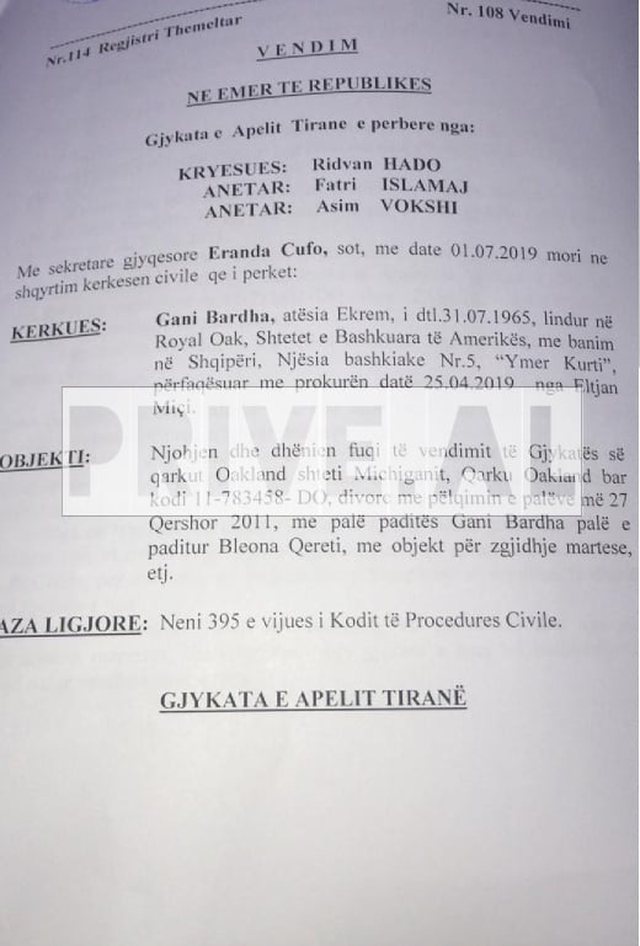 Ky detaj është kuptuar nga një aktvendim i Gjykatës së Apelit në Tiranë të cilin e ka siguruar nga “Prive.al”, ku Gani Bardha ka kërkuar njohjen dhe dhënien në fuqi ligjore për zbatim të vendimit të vitit 2011 nga Gjykata e huaj në Michigan për divorcin. Pas shqyrtimit të kërkesës së parashtruar nga Bardha, trupa e gjyqtarëve kanë marrë aktvendimin në të cilin njohin në fuqi për territorin e Shqipërisë divorcin e çiftit, tetë vite pasi ai ishte kryer në SHBA. Ky detaj tregon se dyshja paskan harruar të ndahen me letra.