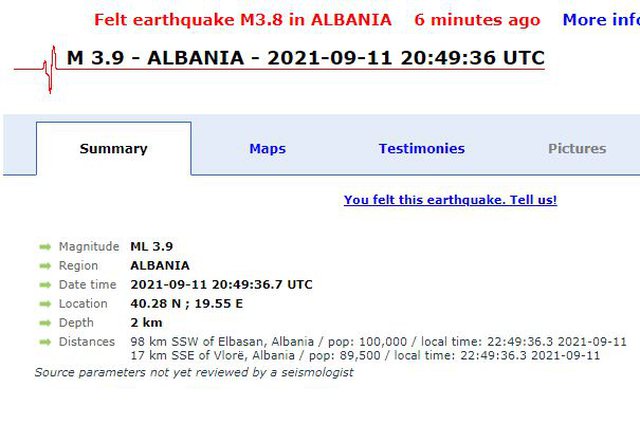Aplikacioni i ESMC njofton per nje fuqi prej 3.8 rihter nderkohe qe Instituti i Gjeoshkences ne Tirane ende nuk e ka konfirmuar ngjarjen.