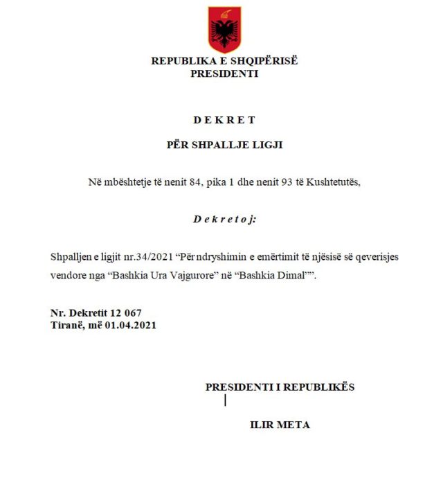 “Ndryshimi i emërtimit të njësisë së qeverisjes vendore, “Bashkia Ura Vajgurore” në “Bashkia Dimal”, një emërtim i lashtë që i sjell identitet zonës, është një hap që vjen në përputhje me interesat ekonomikë e socialë, traditën, kulturën, lidhjet tradicionale dhe vlerat e tjera vendore, të kësaj bashkie. Ky ligj materializon vullnetin e popullsisë së zonës, pas një procesi të gjerë konsultimi me banorët e kësaj bashkie”, thuhet në deklaratën e Presidencës.