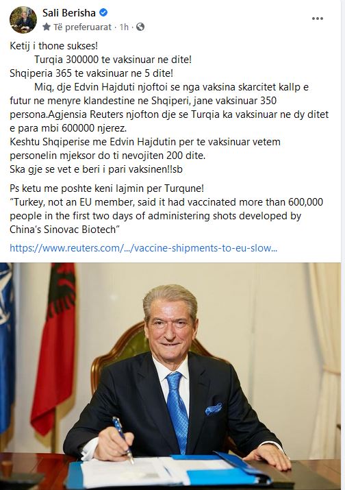Agjensia Reuters njofton dje se Turqia ka vaksinuar në dy ditët e para mbi 600.000 njerëz. Kështu, Shqipërisë me Edvin Hajdutin për të vaksinuar vetëm personelin mjekësor do t’i nevojiten 200 ditë. S’ka gjë se vet e bëri i pari vaksinën!” nënvizon po me ironi Berisha teksa publikon edhe lajmin e Reuters, që flet mbi ecurinë e procesit të vaksinimit në disa vende të botës.