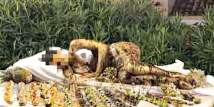 Një tavolinë buzë pishinës dhe mbi të një vajzë me rroba banjo e mbuluar me çokollata në gjithë trupin e saj.