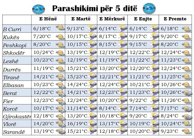 Dita e hënë pritet të jetë me alternime kthjellimesh e vranësirash deri të dendura të cilat në zonën e jugut dhe pjesërisht qendër do të shoqërohen me reshje shiu me intensitet të ulët, ndërsa dita e marta deri të enjte do të jetë vranësira e alternime kthjellimesh.