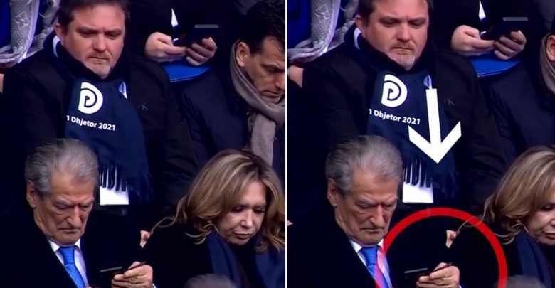 Po kaq i përqendruar duket edhe aktori Julian Deda i cili në distancë mundohet të lexojë mesazhet që i kanë ardhur ish-kryeministrit Berisha.