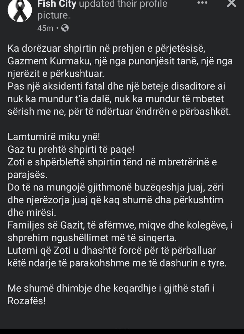 Ka ndërruar jetë në spital, Gazment Kurmaku, kryekamrieri i Fish City, i cili u qëllua me thikë, pak ditë më parë nga një klient. Kurmaku nuk ka mundur dot t’i mbijetojë plagëve. Lajmi është konfirmuar nga vetë restoranti, përmes një postimi në facebook. Lajmi për ngjarjen ka ardhur para disa ditësh, kur kryekamarieri ishte në vdekje klinike.