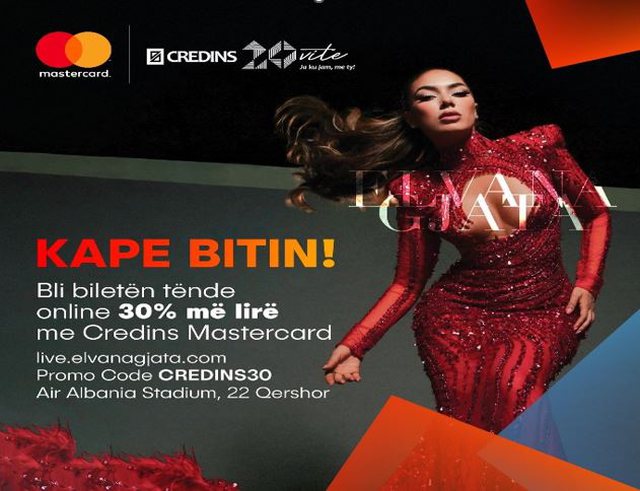 Të gjithë klientët ekzistues që disponojnë një Credins Mastercard, kanë mundësi të blejnë biletën e tyre me 30% ulje nëpërmjet promokodit CREDINS30 për të parë live koncertin e Elvana Gjatës.