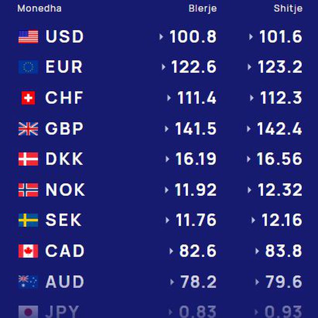 Më poshtë do të gjeni kursin e këmbimit valuator të përditësuar: Dollari: Blihet 100.8 Shitet 101.6