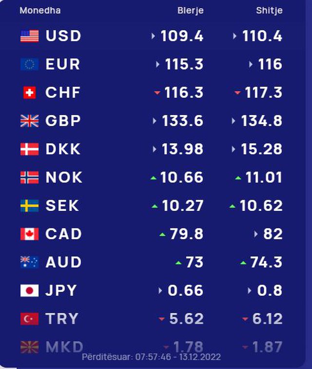 Edhe euro ashtu si një ditë më parë do të blihet me 115.3 lekë dhe do të shitet me 116. Rënie ka pësuar franga zvicerane, e cila sot do të blihet me 116.3 lekë dhe do të shitet me 117.3 lekë.