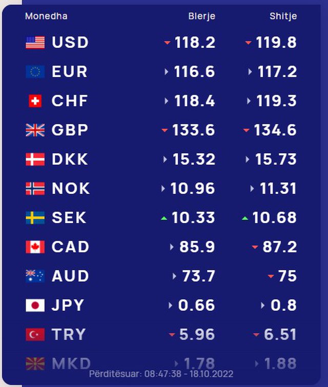 Dollari amerikan është blerë këtë të martë, 18 Tetor me 118.2 lekë dhe është shitur me 119.8 lekë sipas kursit të këmbimit, duke treguar dobësim.