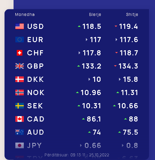 Dollari amerikan është blerë këtë të martë, 25 Tetor me 118.5 lekë dhe është shitur me 119.4 lekë sipas kursit të këmbimit, duke treguar forcim.Sakaq monedha evropiane Euro blihet me 117 lekë dhe shitet me 117.6 lekë, duke treguar qendrueshmëri.