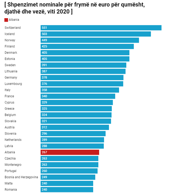 Serbët shpenzojnë për të njëjtat produkte 163 euro, ose 40% më pak. Maqedonia e Veriut shpenzon 198 euro, Mali i Zi 263 euro dhe Bosnjë Hercegovina 249 euro. Të dhënat i referohen vitit 2020, ndërsa Kosova nuk është e përfshirë në këto statistika.