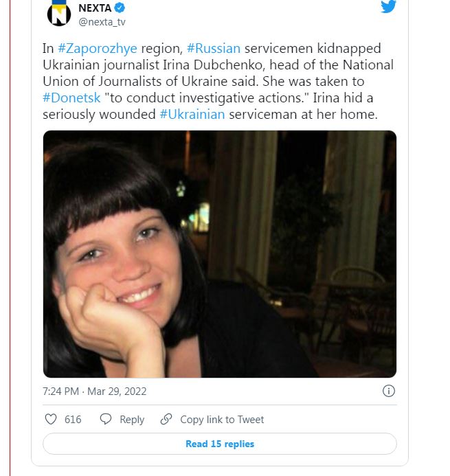 Forcat ruse kanë rrëmbyer një gazetare ukrainase. NEXTA raporton se në rajonin Zaporozhye, forcat ruse kanë kidnapauar gazetaren Irina Dubchenko, e cila është edhe kryetare e Sindikatës Kombëtare të Gazetarëve të Ukrainës.