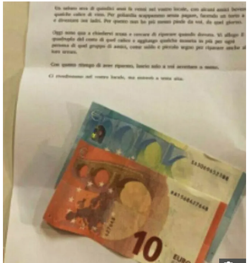 Stafi i Simposio Bar në Trente në Italinë qendrore u cuditen kur hapën një letër anonime nga ‘pijetari’ i përfshirë nga ndjenja e fajit, ku kishte dhe 30 euro para të thata.