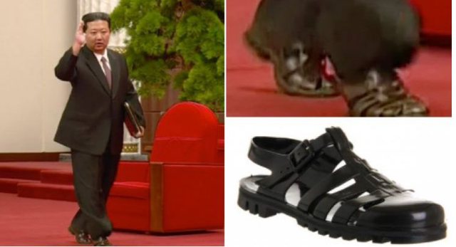 Siç vënë në pah mediat, Kim doli mbi tapetin e kuq të një salle, i veshur me sandale të zeza me shkëlqim mbi çorape të zeza, për të plotësuar kostumin e tij të errët, kravatë dhe syze me gjysmë buzë, sipas videos të transmetuar nga media shtetërore të hënën.