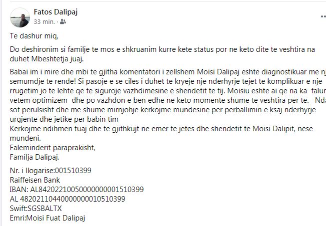 Te dashur miq, Do deshironim si familje te mos e shkruanim kurre kete status por ne keto dite te veshtira na duhet Mbeshtetja juaj. Babai im i mire dhe mbi te gjitha komentatori i zellshem Moisi Dalipaj eshte diagnostikuar me nje semundje te rende!