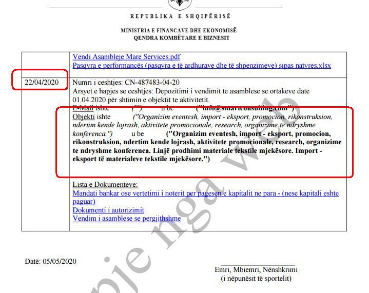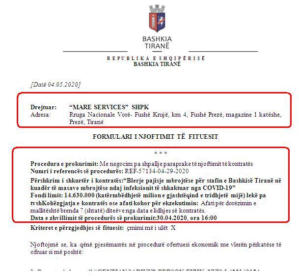 Për 4 vjet rresht, “Mare Services”, referuar të dhënave të Qendrës Kombëtare të Regjistrimit (QKR) nuk ka pasur asnjë lidhje me prodhime tekstile apo me pajisje që mund të shërbejnë për mbrojtjen e shëndetit të njerëzve. Por, në Prill të vitit 2020, kompania “Mare Services” bën një lëvizje në aktivitetin e saj tregtar. Ajo shton një linjë prodhimi tekstilesh dhe, menjëherë fiton tenderin pa garë të Bashkisë së Tiranës. Tender, një javë pas linjës së tekstilit Në 22 Prill 2020, vetëm një javë para se Bashkia e Tiranës të zhvillonte tenderin pa garë, “me negociim, pa shpallje paraprake”, kompania “Mare Services” regjistron në QKR një ndryshim në objektin e veprimtarisë së saj.