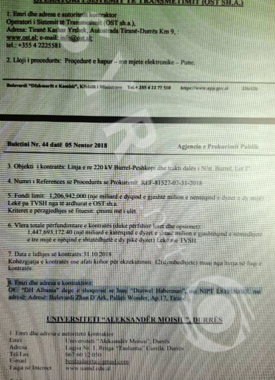 Sipas dokumenteve të siguruar nga Agjencia e Prokurimeve Publike, tenderi është zhvilluar në nëntor dhe Dunwell Haberman Albania e ka fituar atë me 100 për qind të vlerës limit.