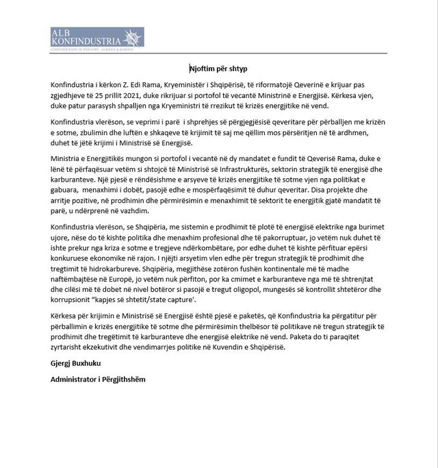 LETRA E PLOTË: Konfindustria i kërkon Z. Edi Rama, Kryeministër i Shqipërisë, të riformatojë Qeverinë e krijuar pas zgjedhjeve të 25 prillit 2021, duke rikrijuar si portofol të vecantë Ministrinë e Energjisë. Kërkesa vjen, duke patur parasysh shpalljen nga Kryeministri të rrezikut të krizës energjitike në vend.
