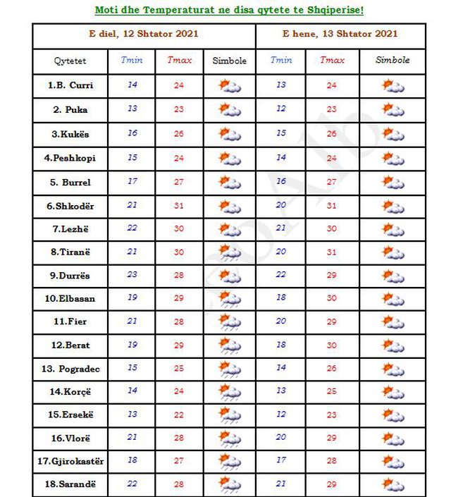 Sipas MeteoAlb, temperaturat e ajrit do të rriten në mëngjes, por do të pësojnë rënie në zonat jugore gjatë mesditës duke luhatur vlerat ditore nga 13°C deri në 31°C.