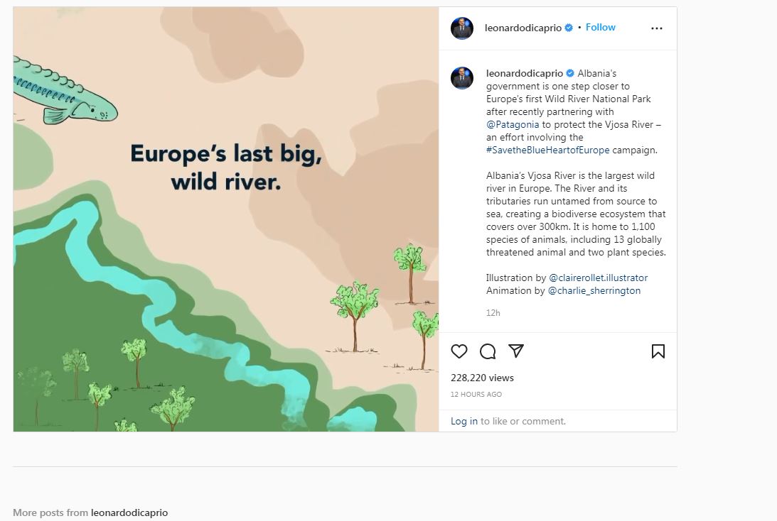 Lumi Vjosa i Shqipërisë është lumi më i madh i egër në Europë. Lumi dhe degët e tij rrjedhin të pazbutur nga burimi në det, duke krijuar një ekosistem të biodiversitetit që mbulon mbi 300 km. Ajo është shtëpia e 1,100 llojeve të kafshëve, duke përfshirë 13 kafshë të kërcënuara globalisht dhe dy specie bimore”, shkruan Leonardo di Caprio.