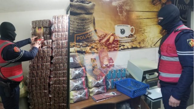 Gjatë kontrollit të ushtruar nga shërbimet e Policisë, në ambientet në pronësi të shtetasit M.B., të marrë në përdorim nga shtetasi D. J., u gjetën dhe u sekuestruan 123 kilogramë kafe, të ndara në paketime, me mbishkrime të ndryshme.