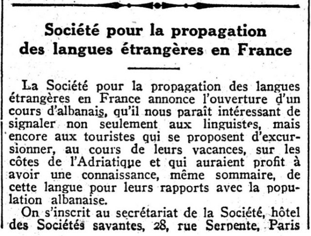“Shoqata për përhapjen e gjuhëve të huaja në Francë njofton hapjen e një kursi në gjuhën shqipe, i cili na duket interesant ta lajmërojmë jo vetëm për gjuhëtarët, por edhe për turistët që duan të shkojnë me pushime gjatë brigjeve të Adriatikut dhe kështu mund të përfitojnë nga njohja, madje edhe minimale e kësaj gjuhe, për të shkëmbyer me popullatën shqiptare.