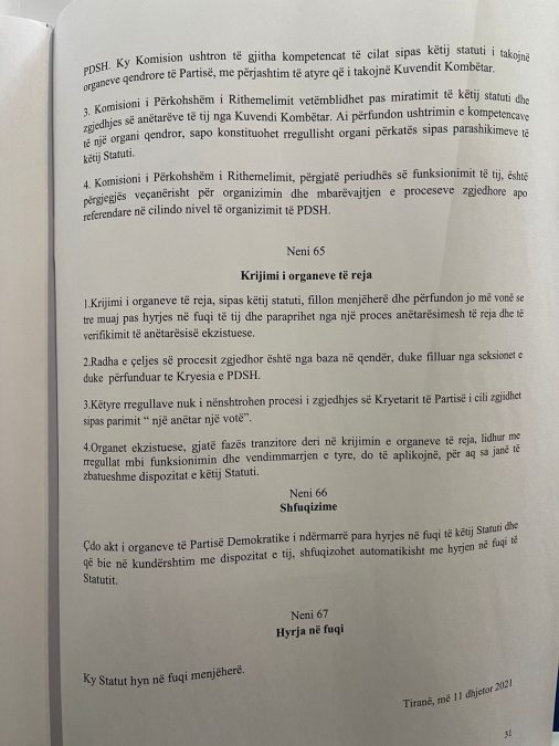 Ai ritheksoi se, “në zbatim të nenit dhe statutit të PD-së një grup anëtarësh të këshillit kombëtar që janë më shumë se ¼ e tij, sipas firmave, propozojnë miratim të projekt/ndryshimeve të statutit të PD-së”.