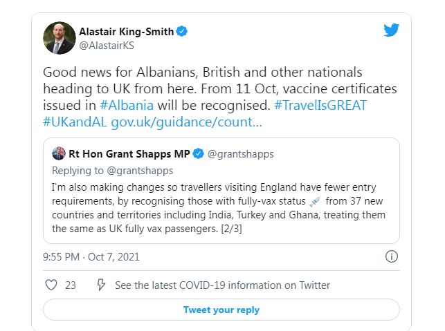 “Lajm i mirë për shqiptarët, britanikët dhe shtetasit e tjerë që nisen për në Mbretërinë e Bashkuar nga Shqipëria. Nga 11 tetori, certifikatat e vaksinave të lëshuara në Shqipëri do të njihen edhe në Britaninë e Madhe”, shkruan ai.