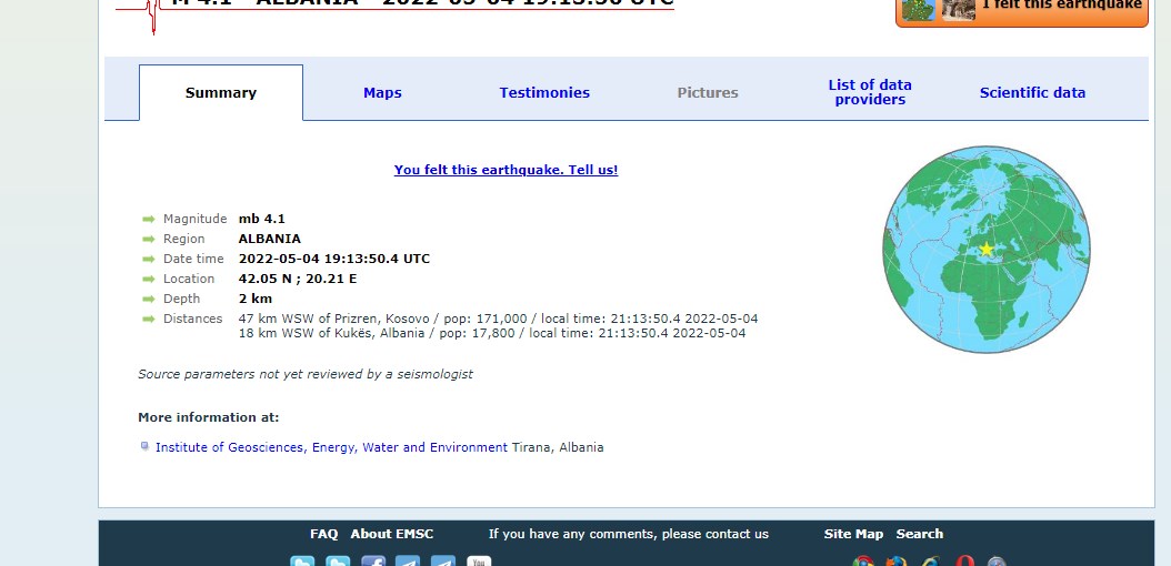 Një tërmet është regjistruar në vendin tonë pak minuta më parë. Mësohet se një nga tërmetet ka qenë me magnitudë 4.1 të shkallës rihter. Epiqendra e saj thuhet se ishte 15 km nga Fushë-Arrëzi i Lezhës, ndërsa thellësia fokale është 2 km. Deri më tani nuk ka raportime për persona të lënduar apo dëme materiale.