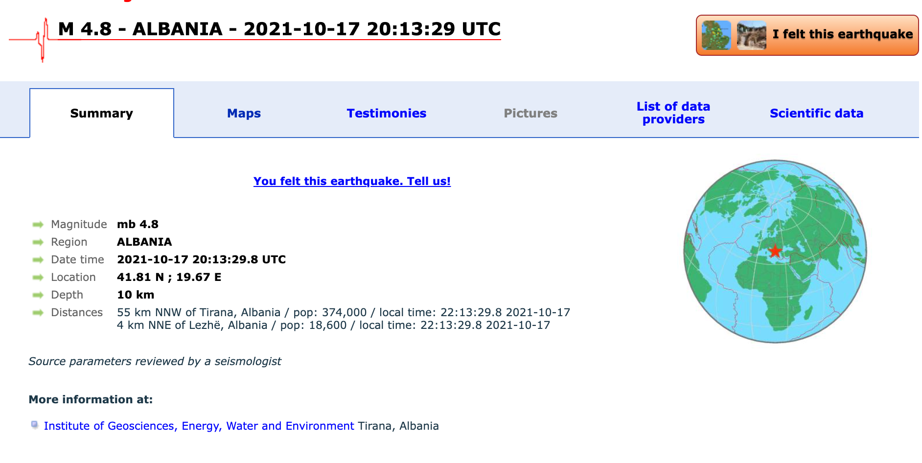 Një tërmet i fortë është ndjerë në Tiranë, ku sipas IMSC-së, ishte 5.0 ballë. Janë ndjerë fuqishëm deri në qytetin e Shkodrës dhe gjithashtu lëlkundje të lehta në Durrës dhe Lezhë. Magnituda raportohet të ketë qenë 5 ballë të shkallës rihter. Deri më tani nuk raportohet për dëme materiale. Vihet re se është në të njëjtën periudhë të tërmeteve të vitit 2019. Mësohet se njerëzit në Lezhë dhe Shkodër kanë dalë jashtë banesave si pasojë e panikut të krijuar prej këkundjeve të forta.