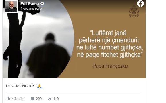 “Luftërat janë përherë një çmenduri, në luftë humbet gjithçka, në paqe fitohet gjithçka”, thuhet në thënien e Atit të Shenjtë, të cilën e ka postuar kryeministri Rama.