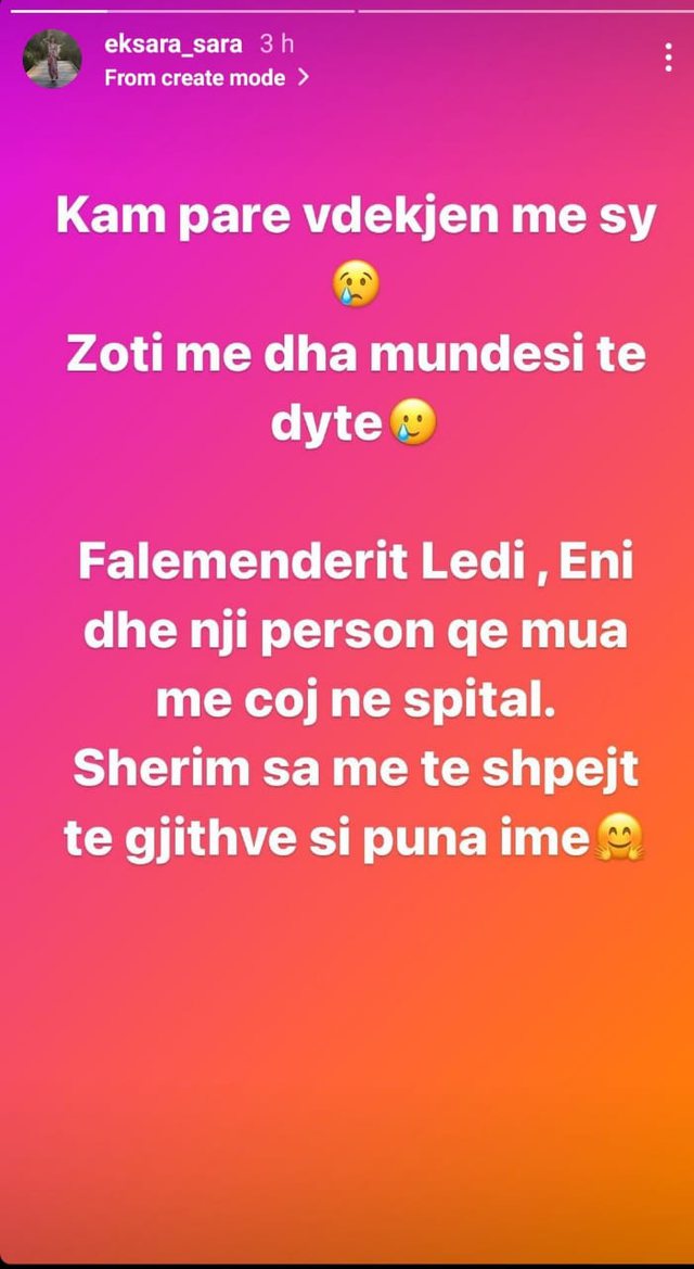 “Kam parë vdekjen me sy, Zoti më dha një mundësi të dytë. Faleminderit Ledi, Eni dhe një person që më çoi në spital. Shërim sa më të shpejtë të gjithëve si puna ime”, shkruan Sara. E reja ka qenë rastësisht në ato momente në lokal, e nuk i shpëtoi plumbave që shënjestër kishin Bledar Muçajn.