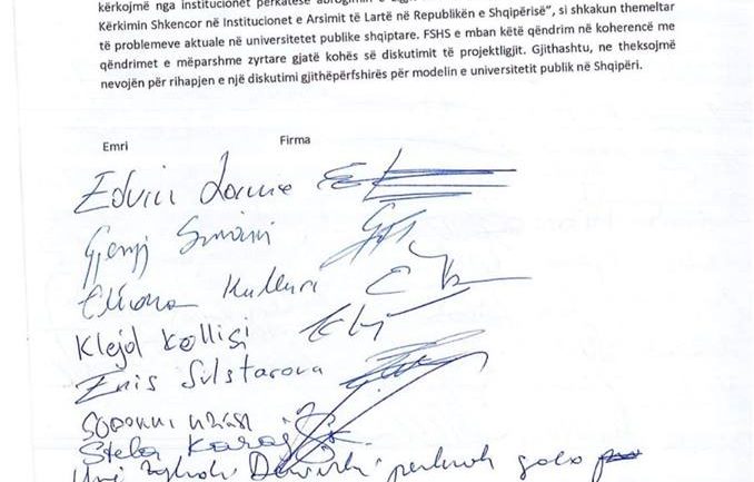 Mbi 50 pedagogë të Fakultetit të Shkencave Sociale kanë firmosur një deklartë sensibilizimi me studentët duke kërkuar njëkohësisht abrogimin e ligjit të arsimit të lartë.