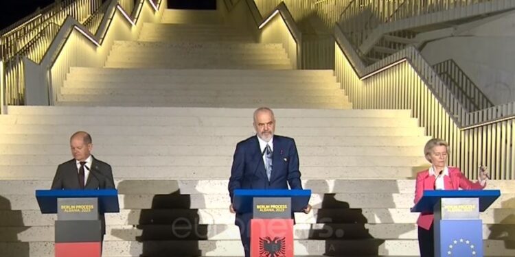 Kryeministri Edi Rama, në mbyllje të Samitit të Procesit të Berlinit, gjatë konferencës për shtyp ka shprehur falënderim për kancelarin Olaf Scholz dhe Presidenten Ursula von der Leyen. Kreu i qeverisë u shpreh se kjo ditë u mbyll me diskutime të frytshme, ndërsa shtoi se Olaf Scholz dhe Presidenten Ursula von der Leyen janë një “fuqi e qetë mbresëlënëse”, që kanë shtyrë BE dhe Ballkanin Perëndimorë për të ardhur më pranë njëri-tjetrit.