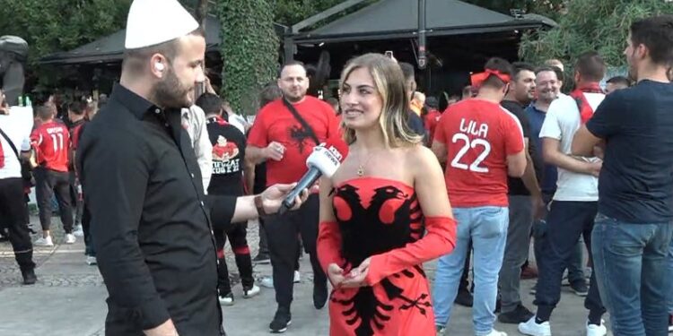 Nga lulishtja e “3 Vëllezërve Frashëri”, pranë bulevardit në Tiranë është një atmosferë e zjarrtë. Një tifoze mjaft e veçantë që përkrah kombëtaren shqiptare e veshur me flamurin shqiptar, ka ardhur posaçërisht nga Brukseli për ta mbështetur Shqipërinë në përballjen me Çekinë.