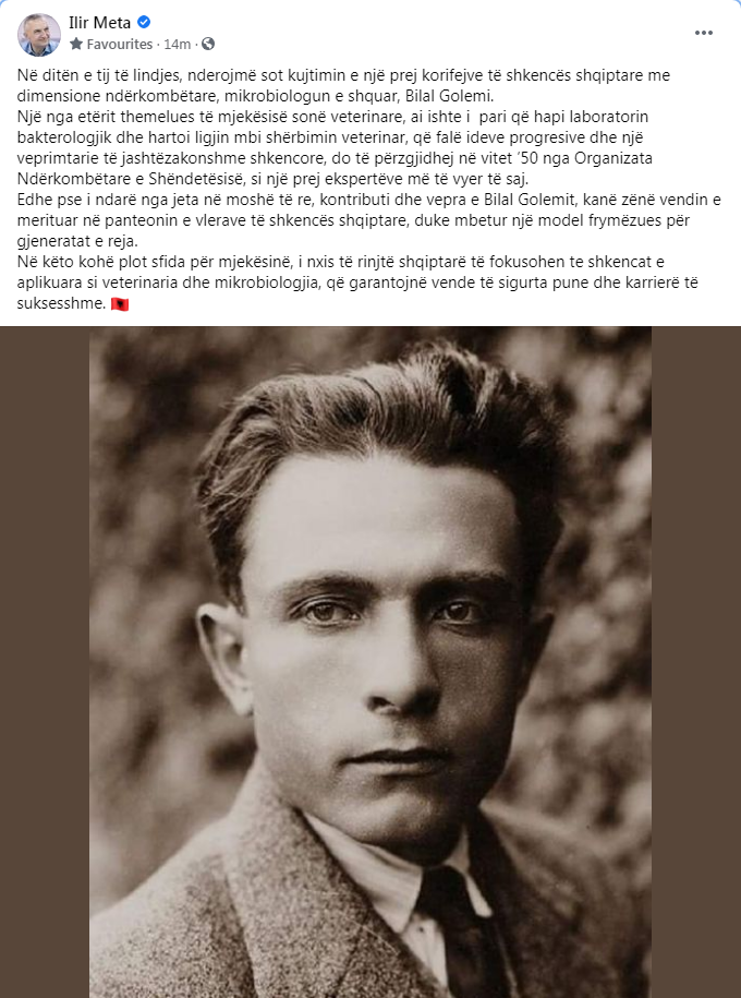 Meta shkruan se edhe pse i ndarë nga jeta në moshë të re, kontributi dhe vepra e Bilal Golemit, kanë zënë vendin e merituar në panteonin e vlerave të shkencës shqiptare, duke mbetur një model frymëzues për gjeneratat e reja.