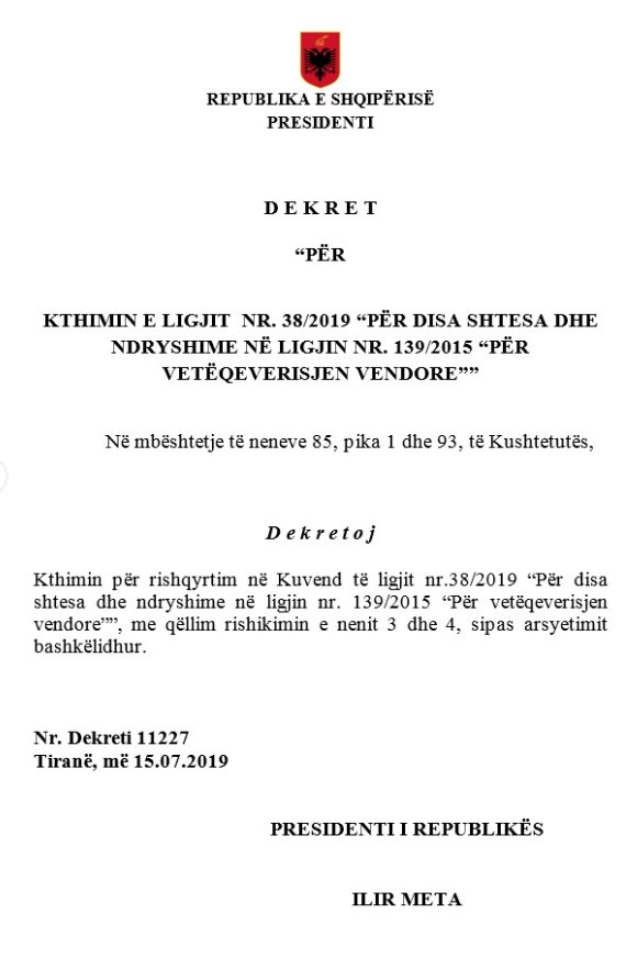 Nisur nga këto qëllime shumë positive Presidenti i Republikës, shpreh dakordësinë e tij për realizimin e shtesave në ligjin ekzistues nr. 139/2015, që bëhen të mundura nëpërmjet dispozitave të nenit 1 të ligjit nr. 38/2019 “Për disa shtesa dhe ndryshime në ligjin nr. 139/2015 “Për vetëqeverisjen vendore””.