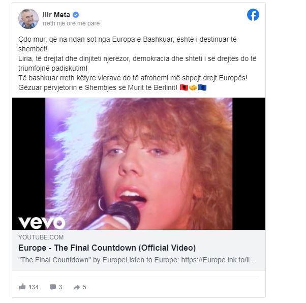 Të bashkuar rreth këtyre vlerave do të afrohemi më shpejt drejt Europës!Gëzuar përvjetorin e Shembjes së Murit të Berlinit!”, shkruan Meta tekasa ka shpërndarë këngën e famshme të grupit “Europe” – “The final countdown”.
