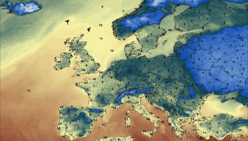 Temperaturat në Kontinentin evropian janë pak a shumë ashtu siç duhej të ishin këtë mes-Nëntori, ndërsa në fotografi kemi temperaturat minimale në tërë Kontientin ku shihet së më së ftohti është në Skandinavi ku temperaturat po ulen deri në -8 gradë Celsius, lokalisht edhe më ftohtë.