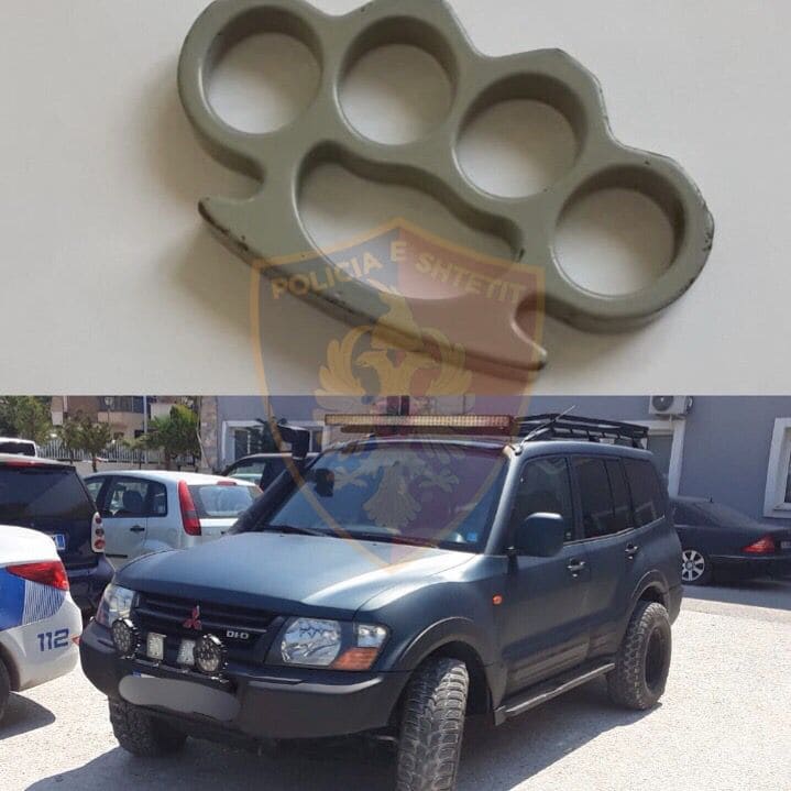 Ndërkohë gjatë kontrollit fizik , 17-vjeçarit i është gjetur dhe sekuestruar një përforcues grushti , ndërsa 37-vjeçarit E.M., iu sekuestrua automjeti i markës “Mitsubishi” të cilin e drejtonte në gjendje të d ehur, momentin kur është ar restuar nga uniformat blu.