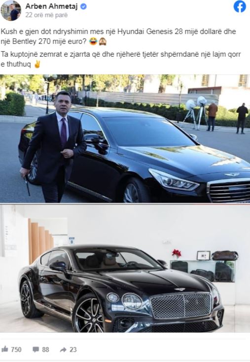 Zv/kryeministri Arben Ahmetaj i është përgjigjur akuzës së të deputetit Edi Paloka, që në Kuvend vjen me makinë 270 mijë dollarë. ”Kush e gjen dot ndryshimin mes një Hyundai Genesis 28 mijë dollarë dhe një Bentley 270 mijë euro? Ta kuptojnë zemrat e zjarrta që dhe njëherë tjetër shpërndanë një lajm qorr e thuthuq”,-shkruan Ahmetaj në facebook.