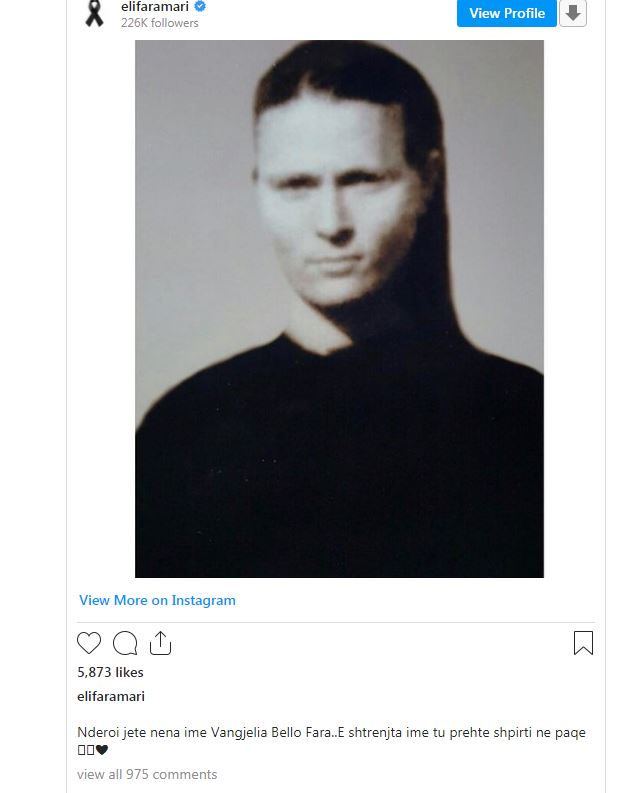 Këngëtarja Eli Fara ka lajmëruar mëngjesin e sotëm se nëna e saj ka ndërruar jetë. Përmes një postimi në Instagram, Eli Fara ka publikuar foton e nënës së saj, ndërsa jep lajmin e hidhur. “Ndërroi jetë nëna ime Vangjelia Bello Fara. E shtrenjta tu prehtë shpirti në paqe”, shkruan këngëtarja.