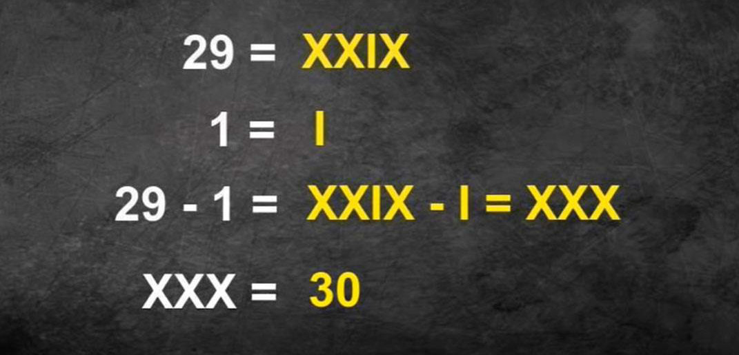 Mendoni mirë dhe përpiquni të mos i përmbaheni rreptësishtë matematikës, jini krijues edhe nëse ende nuk e dini përgjigjen, këtu janë zgjidhjet. Procedura për marrjen e përgjigjes së saktë të kësaj enigme ka habitur shumicën. Domethënë, numrat duhet të shkruhen me numra romakë, dhe kur të bëhet kjo, rezultati është 30.
