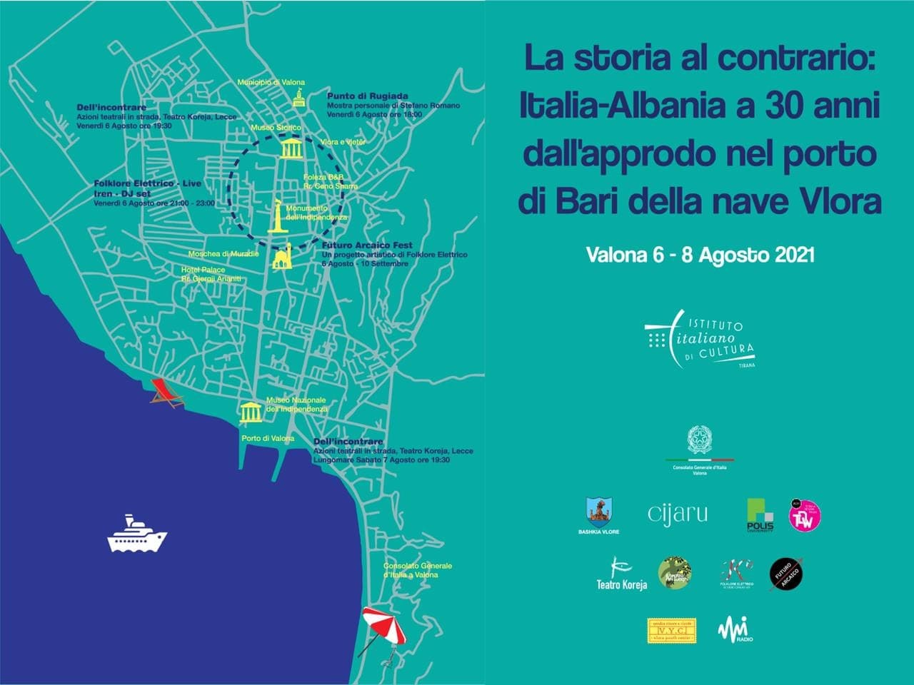 Historia në të kundërt: Itali-Shqipëri 30 vjet pas zbarkimit në portin e Barit të anijes Vlora. Në Vlorë 6-8 Gusht 2021 – Një projekt I Institutit Italian të Kulturës në Tiranë La storia al contrario: Italia-Albania a 30 anni dall’approdo nel porto di Bari della nave Vlora / Valona 6-8 Agosto 2021 – Un progetto dell’Istituto Italiano di Cultura di Tirana / Agenda Punto di Rugiada Mostra di Stefano Romano a cura di Francesco Scasciamacchia / Ekspozitë e Stefano Romano kuruar nga Francesco Scasciamacchia Galleria Alpha Ansambli i Rrugës Justin Godard, Qendra Historike Inaugurazione / Hapja: Venerdì / E premte 6 Agosto / Gusht ore 18:00 La Mostra rimarrà aperta fino al / Ekspozita do të qëndrojë e hapur deri me: 10.09.2021 Lunedi – Sabato / E hënë – shtunë: 16:00 – 22:00 – – – Dell’incontrare Azioni teatrali in strada del Teatro Koreja, Lecce / Shfaqje teatrale në rrugë nga Teatri Koreja Ansambli i Rrugës Justin Godard, Qendra Historike Venerdì / E premte 6 Agosto / Gusht ore 19:30 Lungomare Sabato / E shtunë 7 Agosto / Gusht ore 19:30 – – – Futuro Arcaico Fest Un progetto artistico di / Një projekt artistik i:Folklore Elettrico Cortile Galleria Alpha Ansambli i Rrugës Justin Godard, Qendra Historike 6 Agosto / Gusht – 10 settembre / shtator – – – Folclore Elettrico – live Iren – DJ Set Ansambli i Rrugës Justin Godard, Qendra Historike Venerdì/ E premte 6 Agosto/Gusht ore 21:00 – 23:00