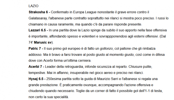 Rusët e ngacmuan pak por kur u thirr në apel nuk gabojë në asgjë”. Si gjithnjë titullar fiks për Lazio ishte dhe Elseid Hysaj, një nga lojtarët më të vlerësuar, nota 6.5: