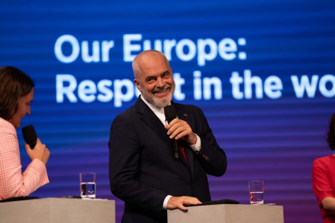 Kryeministri Edi Rama ka shkëmbyer dhe një batutë në fund të fjalimit të tij në Berlin me moderatoren e Kongresit të Socialistëve&Demokratëve Europianë. Teksa mbaroi koha në dispozicion të tij, Rama i tha moderatores se nuk duhet të kërkojë asnjëherë kufij kohe kur do të flasë me burra nga Ballkani.