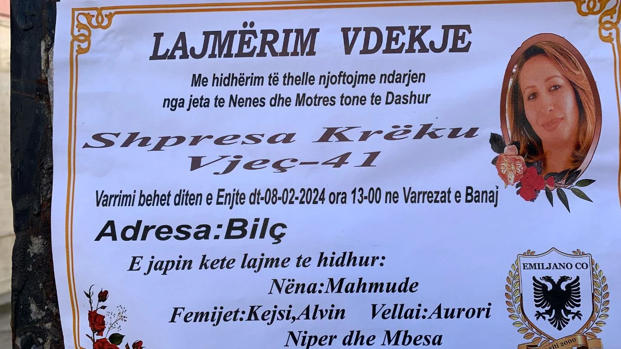 Ende është mister shkaku i vetëhelmimit të nënës së dy fëmijëve, ndërkohë që në lajmërinin e vjekjes nuk përmendet emri i bashkëshortit,vetëm prindërit,vëllai dhe fëmijët. Burime brenda familjes pohojnë se 41-vjeçarja ka kërkuar në momentet e fundit të jetës ta varrosnin në fshatin Banaj, pranë familjes së saj.