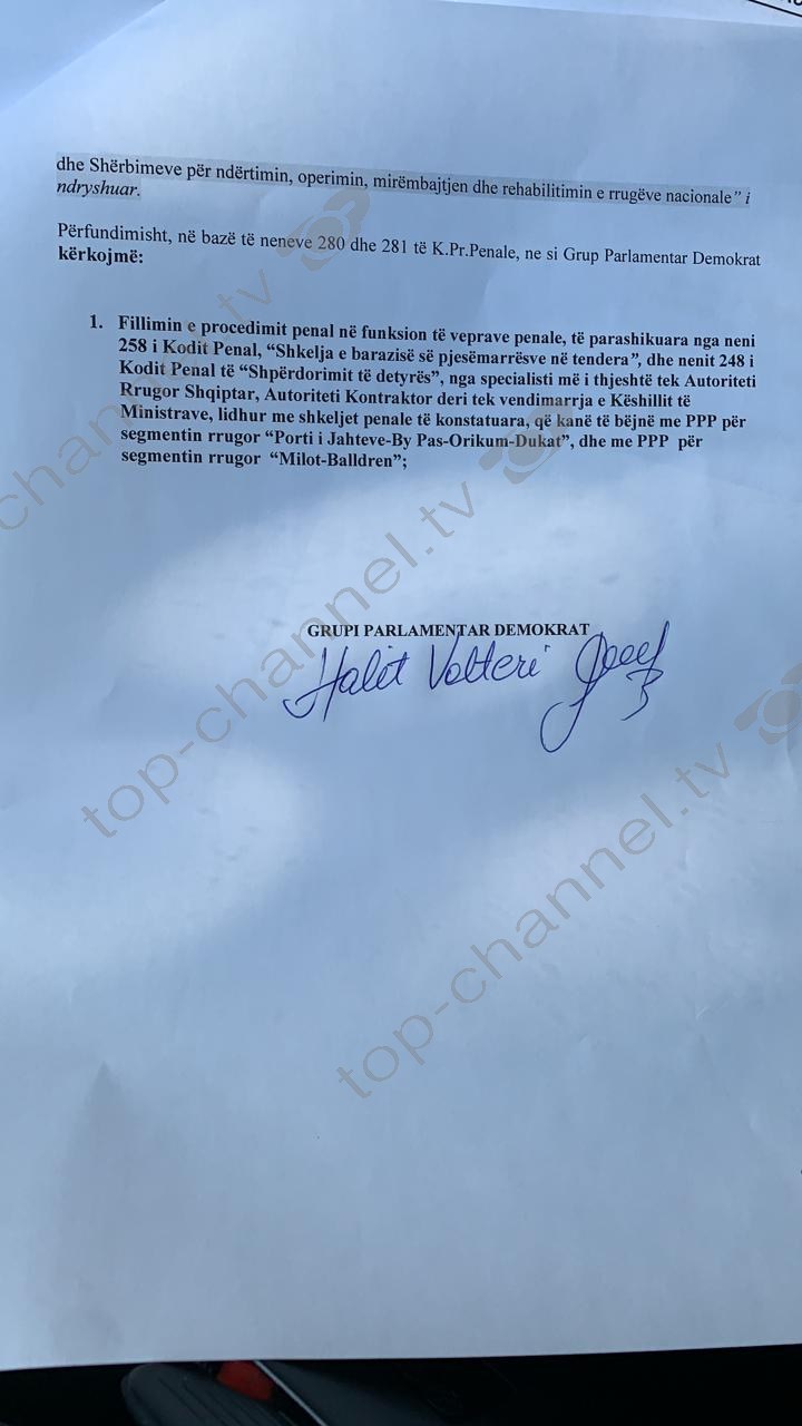 Në emër të grupit parlamentar demokrat, deputet Halit Valteri depozitoi në Prokurorinë e Tiranës një kallëzim penal për PPP Orikum-Dukat dhe Milot-BalldrenKallëzimi i opozitarëve të rinj vjen pak ditë pasi shumica parlamentare rrëzoi në parlament dekretet presidenciale që rikthyen për rishqyrtim dy koncesionet më të mëdha të rrugëve.