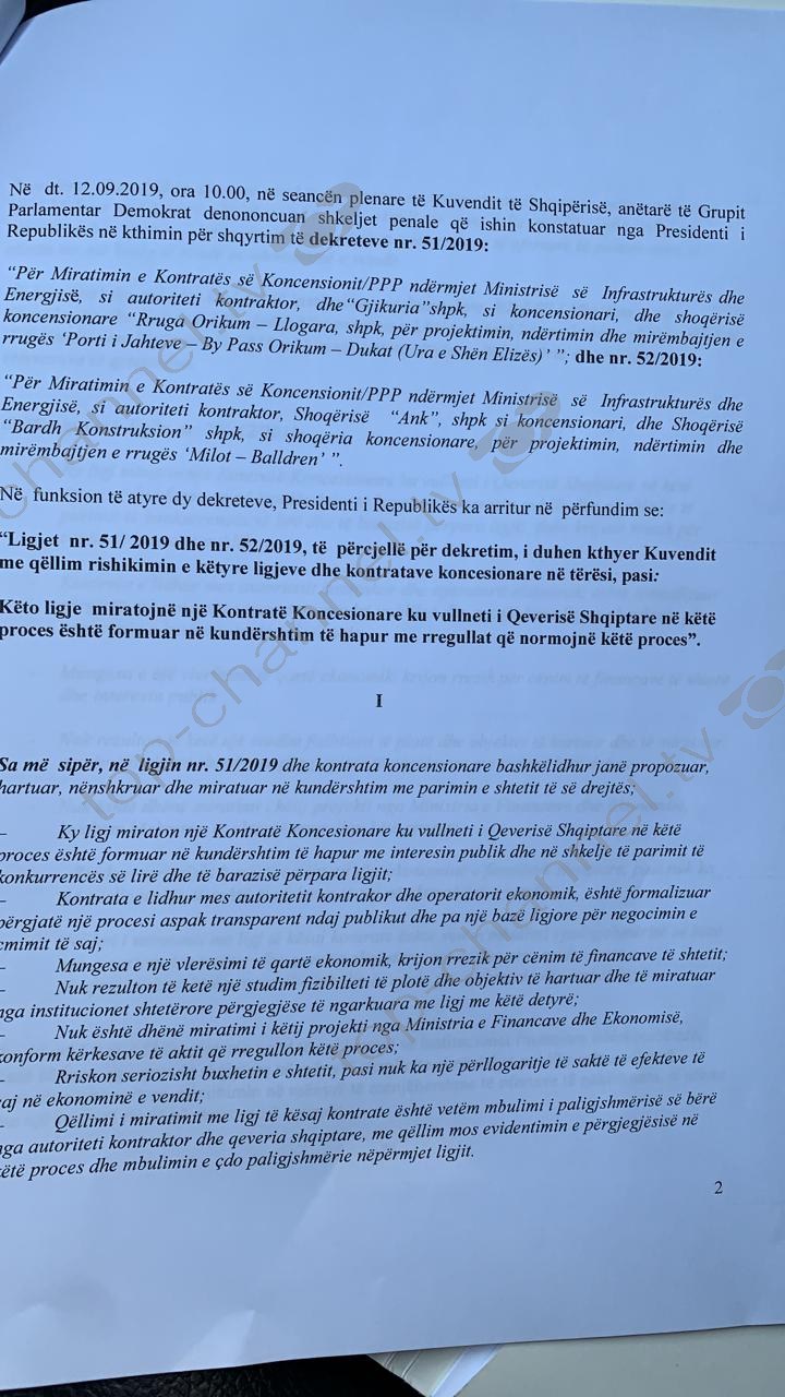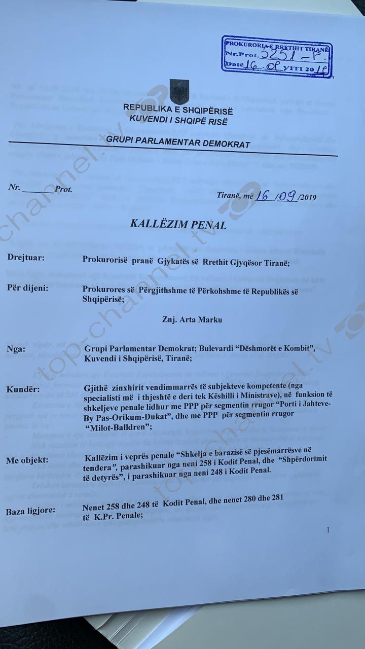 Në emër të grupit parlamentar demokrat, deputet Halit Valteri depozitoi në Prokurorinë e Tiranës një kallëzim penal për PPP Orikum-Dukat dhe Milot-BalldrenKallëzimi i opozitarëve të rinj vjen pak ditë pasi shumica parlamentare rrëzoi në parlament dekretet presidenciale që rikthyen për rishqyrtim dy koncesionet më të mëdha të rrugëve.